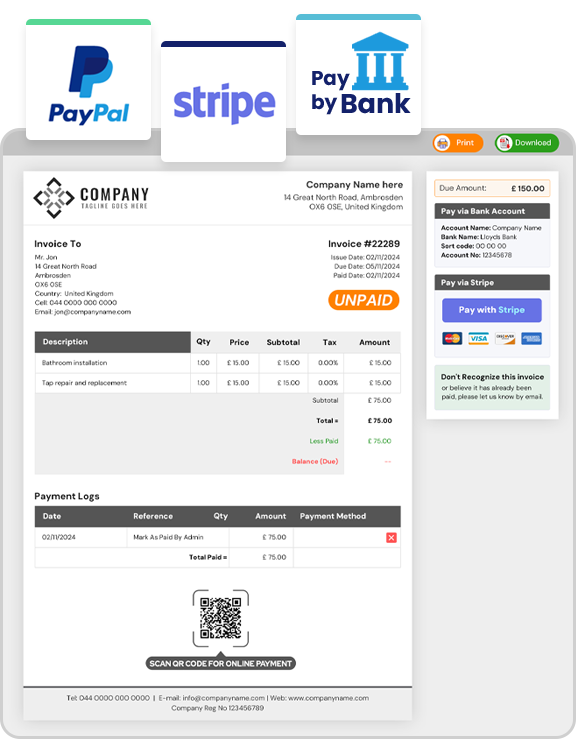 Easily manage customers by saving their details for faster billing and tracking unpaid invoices anytime. Accept online payments via Stripe, PayPal, or bank transfer for added convenience. Set up automatic reminders to ensure timely payments from clients.